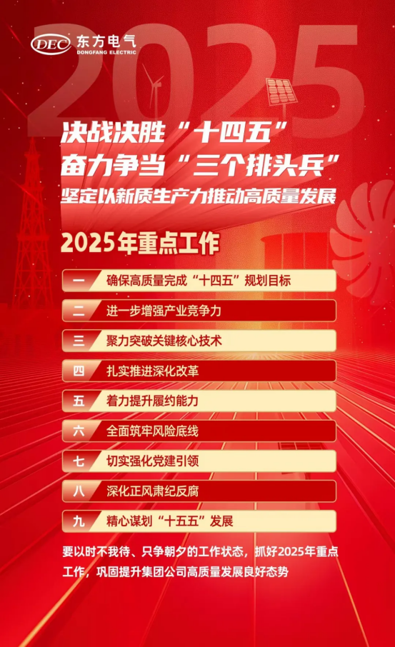1月19日,东方汽轮机召开第十一届五次职代会暨2025年度工作会议,全面总结2024年工作情况,分析当前形势任务,安排部署2025年重点工作,号召全体干部职工紧紧聚焦公司发展战略,锚定核心目标任务,以团结凝聚力量,用奋斗铸就辉煌。东方汽轮机将坚持“抓当前与谋长远、重效益与促转型、激活力与添动力、保交付与防风险、强党建与转作风”并重,决胜“十四五”,打好收官战,奋力开创公司转型发展新局面。